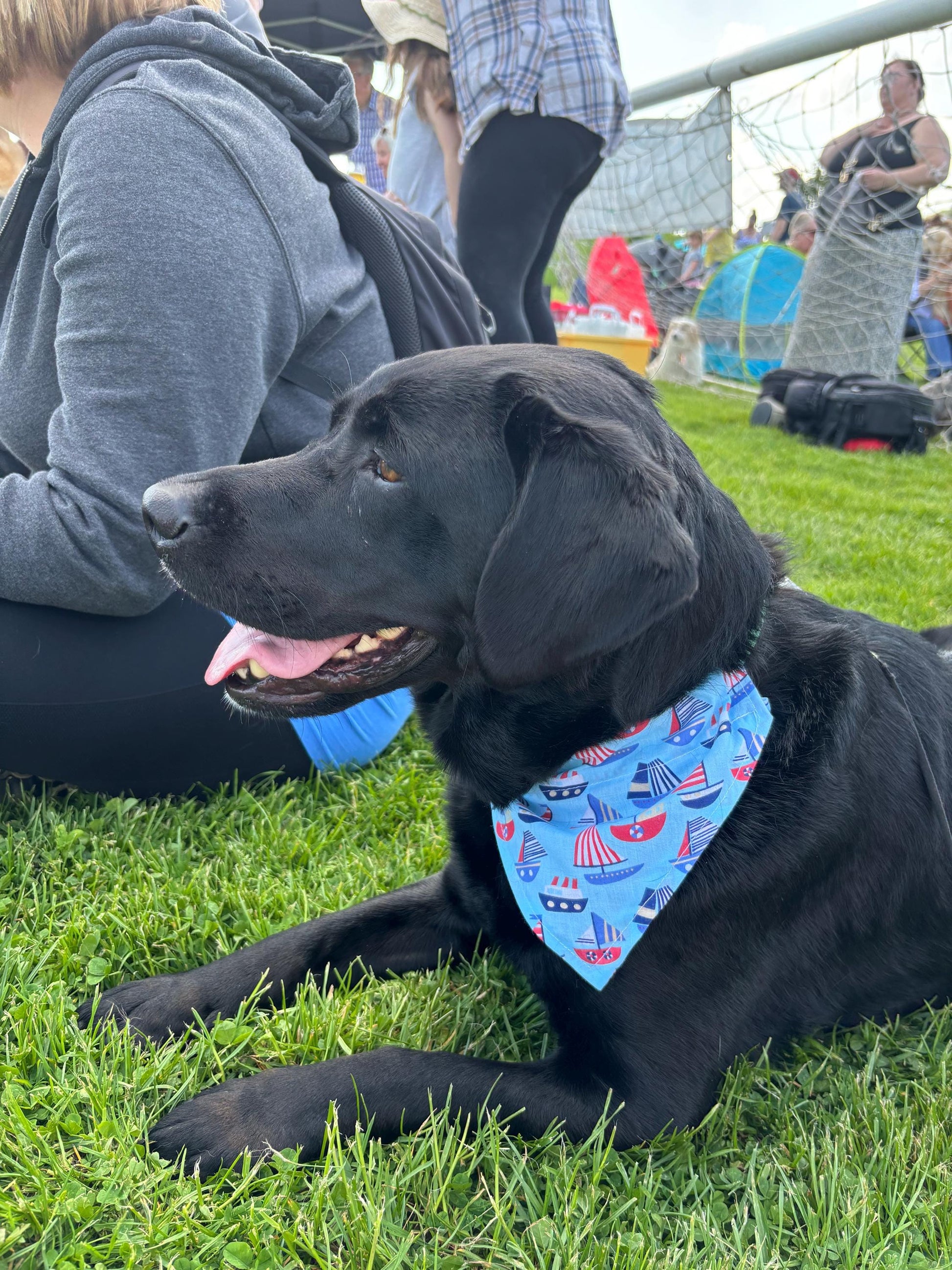 Introducing our The summer Bandana collection, the perfect accessory for your furry friend! This through the collar bandana is available in both large and small sizes, suitable for all dog breeds. Made with high-quality materials, this bandana is not only stylish but also durable and easy to clean. Simply slide it over your pet's collar for a secure fit that won't come off during playtime. Whether you're taking your pup for a walk or a day out, this dog accessory is a must-have. Made from 100% cotton dog bandanas which slip through the collar. None invasive and cannot be pulled off by your dog. Labrador wears large banana Add some bright cheer to your pooch with our dog Bandanas